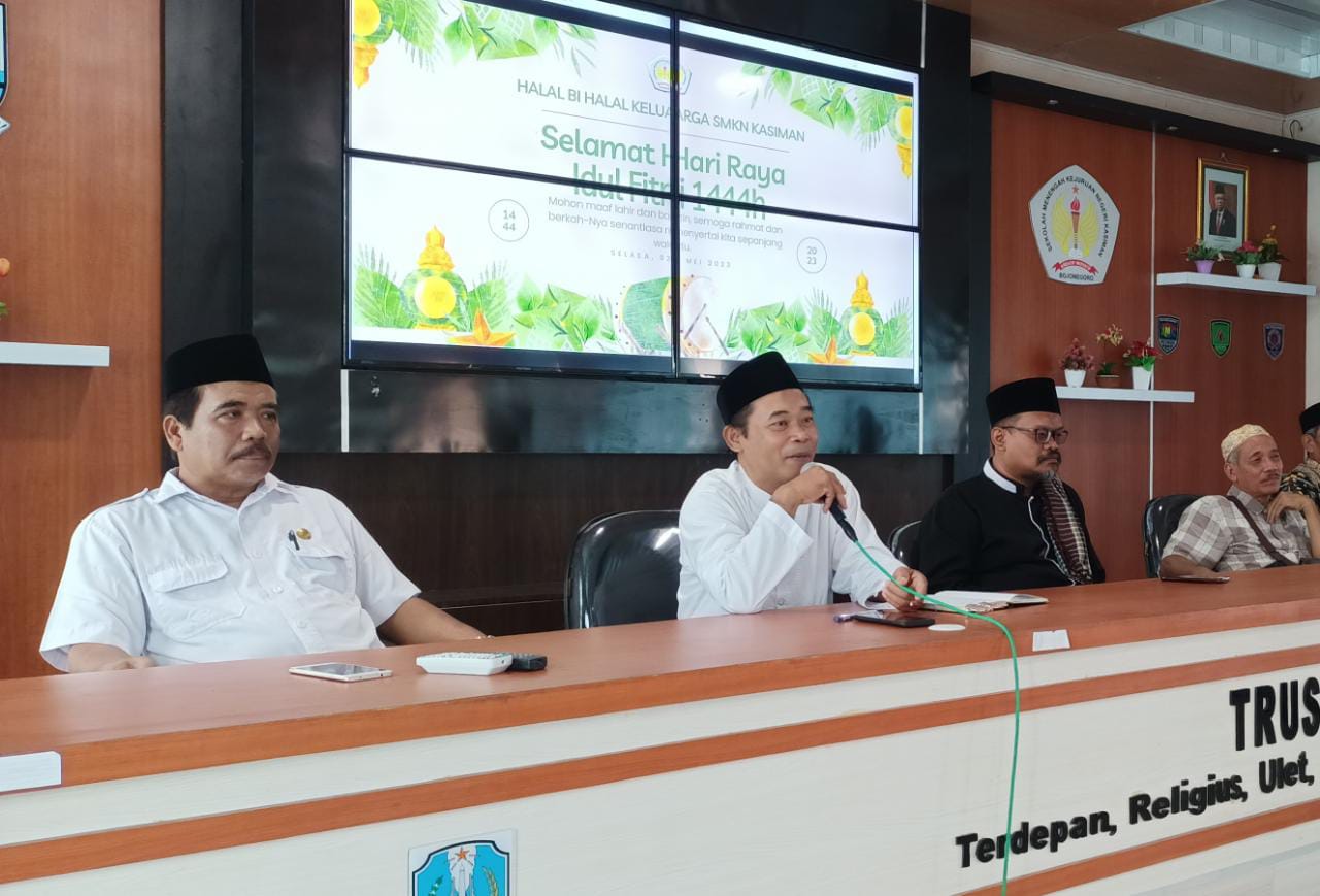 Hal tersebut selaras dengan apa yang disampaikan Ustad Edi Rahmad yang dalam kesempatan ini memberikan tausyiah kepada hadirin yang memenuhi lantai 2 gedung guru SMK Negeri Kasiman. Bertepatan dengan 11 Syawal 1444 H seluruh warga sekolah bertatap muka kembali untuk melakukan kegiatan pembelajaran setelah libur hari raya idul fitri.