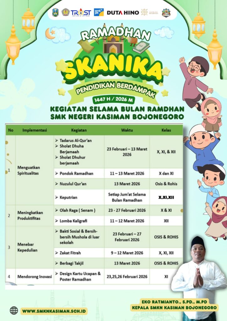 “Di hari-hari biasa, kegiatan sholat berjamaah, sholawat, kajian Islam khusus putri, dll yang dirangkai dalam kegiatan Jumat religi sudah menjadi pembiasaan. Nah, di bulan Ramadhan ini, siswa-siswi SMKN Kasiman dilibatkan dan ditingkatkan lagi aktivitas ibadah dan rasa sosialnya di lingkungan sekitar sekolah. Semoga semua kegiatan ini akan tumbuh dan mengakar di kehidupan siswa nanti,”tutur salah satu guru agama SMKN Kasiman, Bapak Sutrisno sekaligus bertanggung jawab di pokja Kesiswaan.