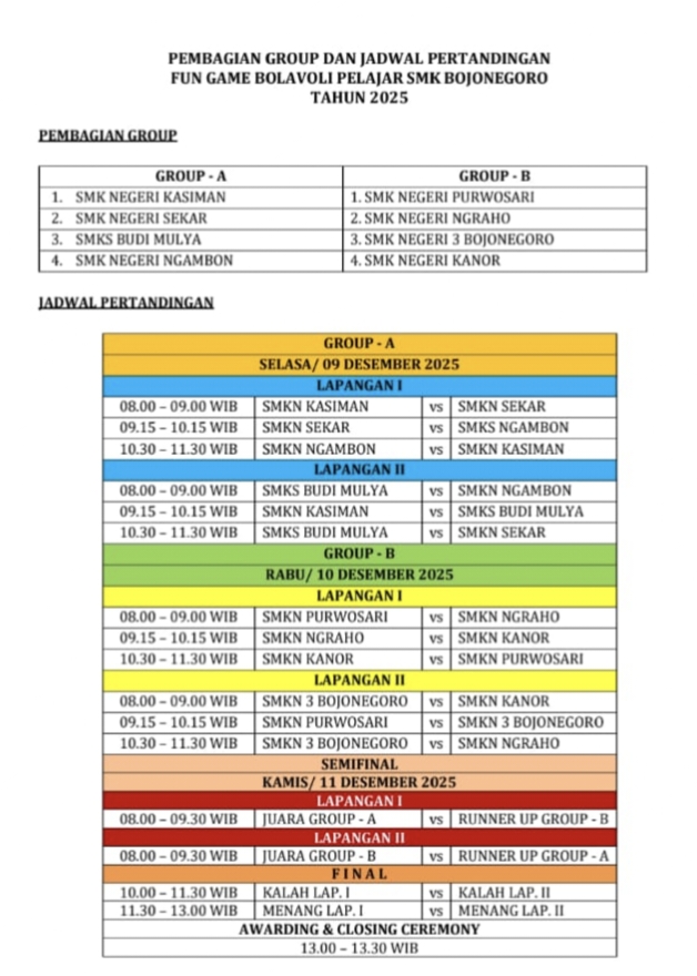 Dalam rangka persiapan Liga Bola Volley Pelajar Tingkat SMK se- Kabupaten Bojonegoro, kegiatan Fun game yang diadakan di TSA (Trust Sport Arena) SMKN Kasiman berlangsung mulai tanggal 9-11 Desember 2025.